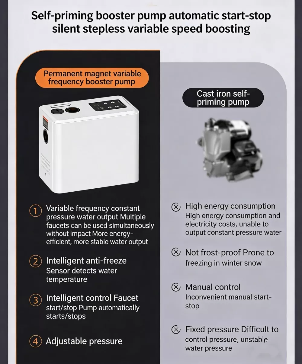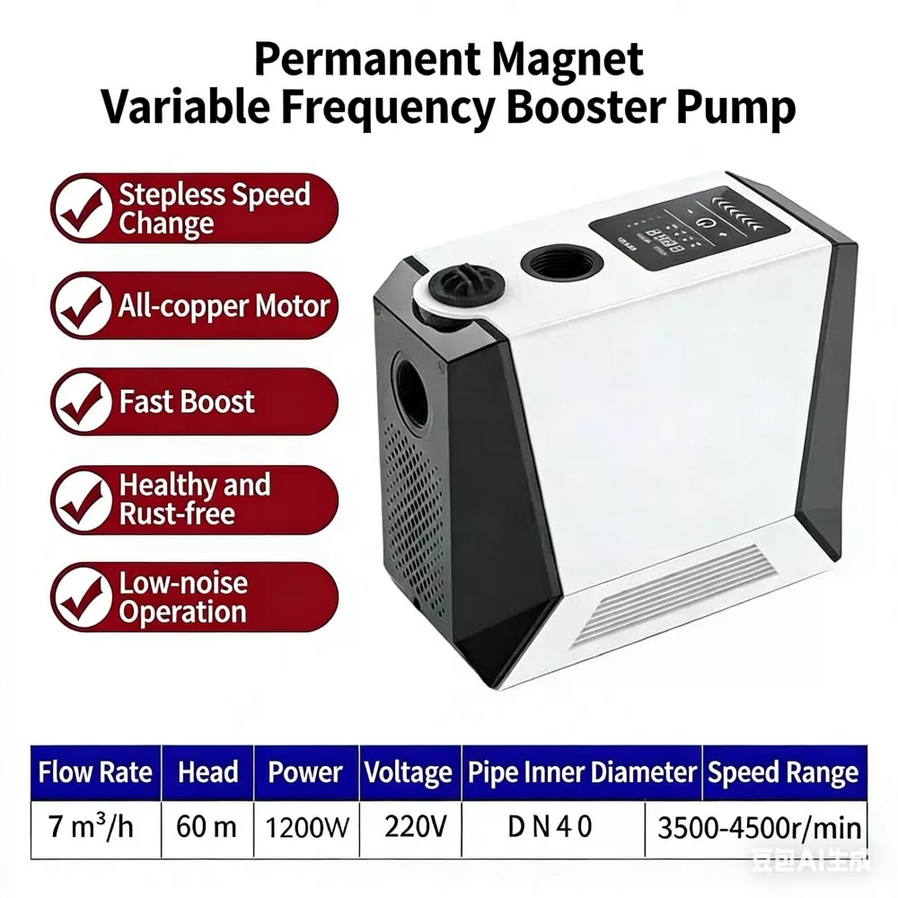 Wenn Sie nach einer hochwertigen Lösung zur Erhöhung des Wasserdrucks für den Haushalt suchen, ist die Permanentmagnet-Druckerhöhungspumpe mit variabler Frequenz die beste Wahl. Im Vergleich zu herkömmlichen Druckerhöhungspumpen auf dem Markt ist unser Produkt mit einem vollständig intelligenten Steuerungssystem, einer stabilen Funktion für konstanten Druck mit variabler Frequenz, einem extrem geräuscharmen Betriebsdesign, einem Hochgeschwindigkeits-Hochleistungsmotor, einem intelligenten Frostschutz und einem kompakten, stilvollen Erscheinungsbild ausgestattet. Es behebt perfekt die allgemeinen Mängel herkömmlicher Pumpen, wie z. B. umständliche manuelle Bedienung, instabiler Wasserdruck, hohes Betriebsgeräusch, leichte Frostschäden im Winter sowie sperrige und schwierige Installation.