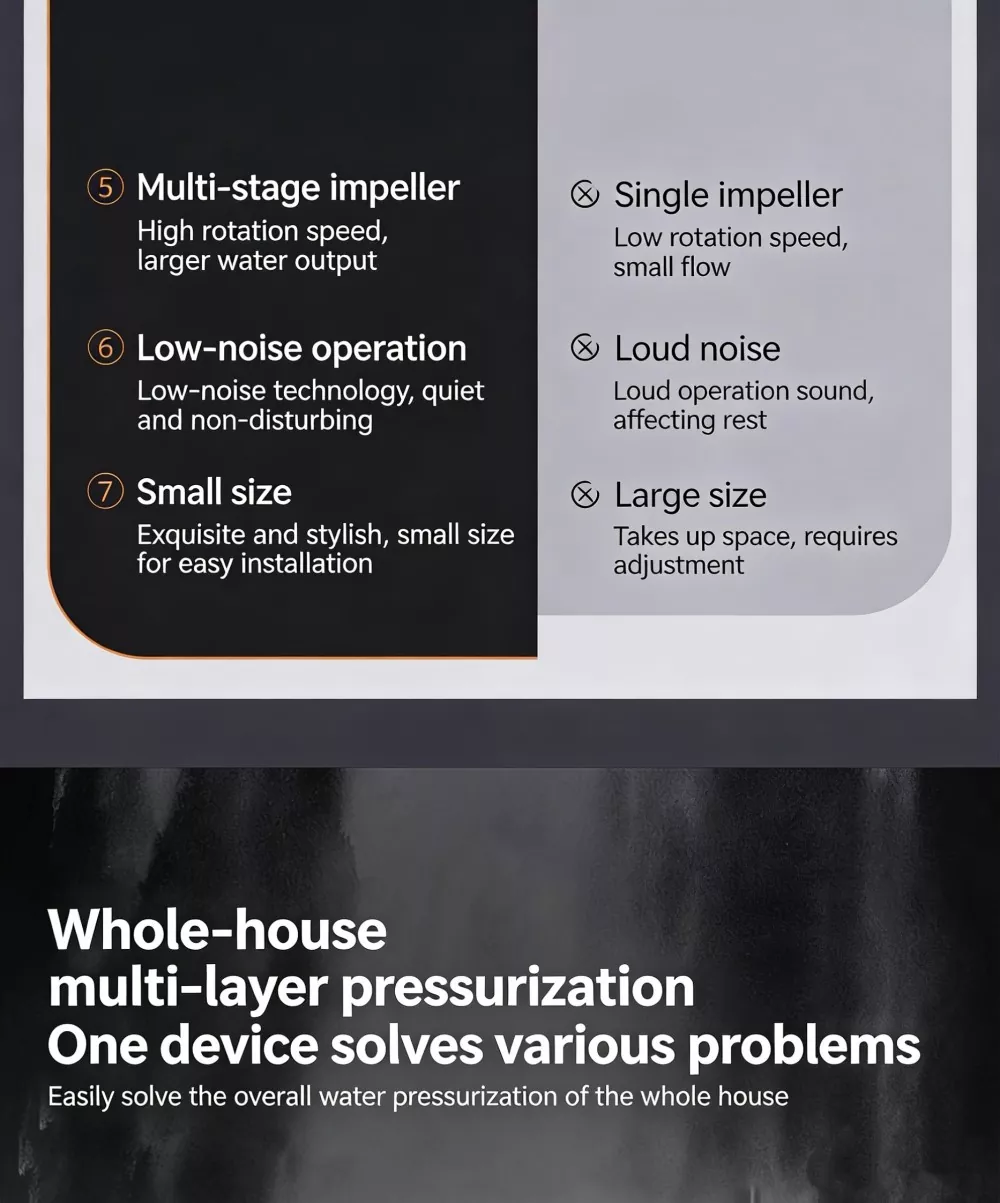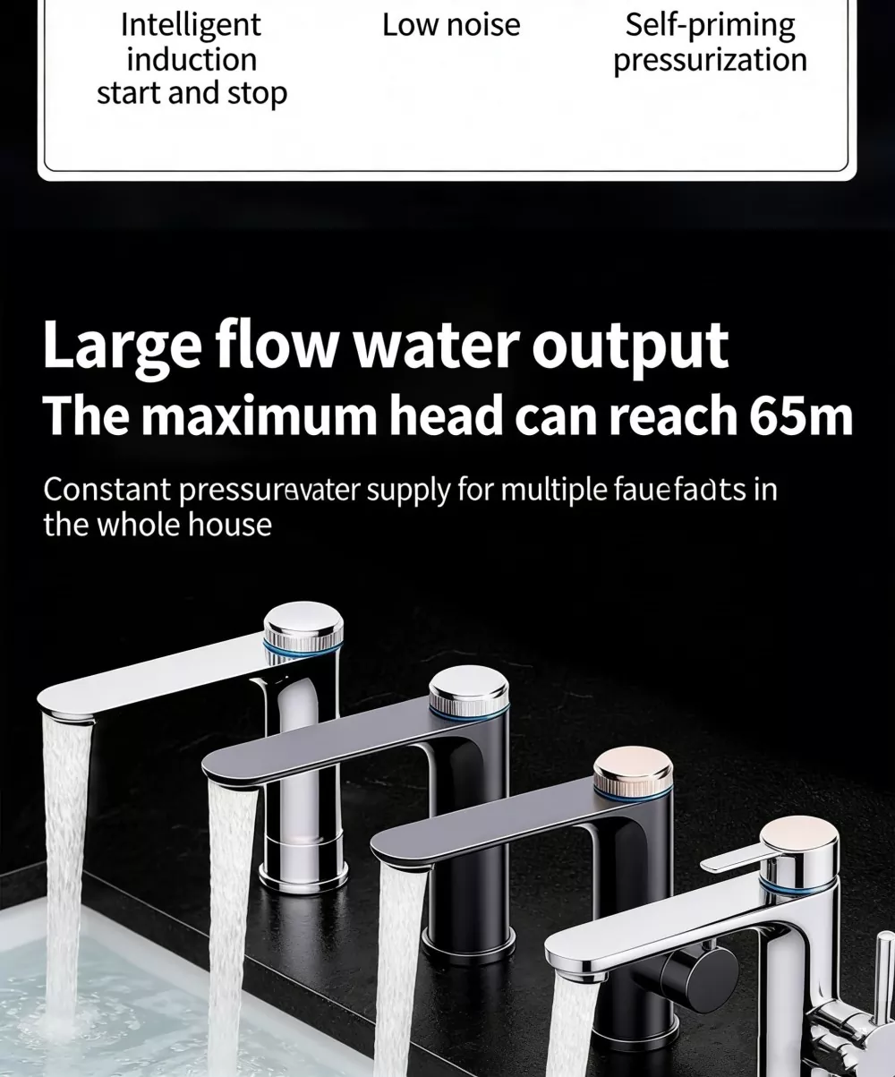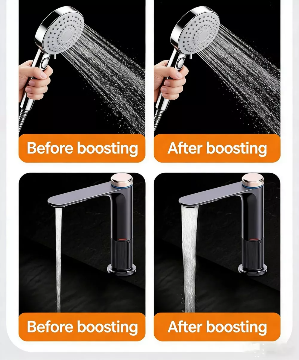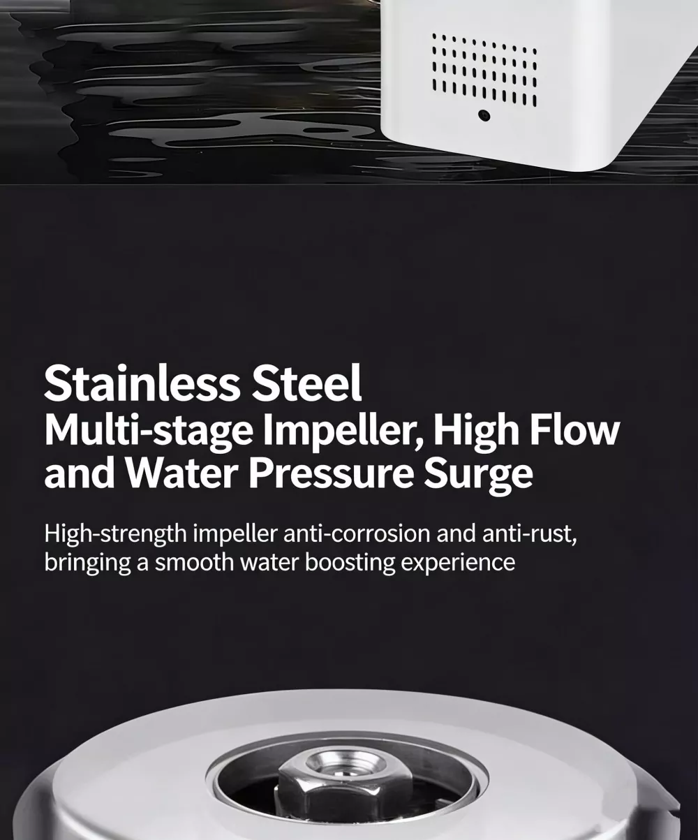 Hochgeschwindigkeitsmotor: Der eingebaute Hochgeschwindigkeitsmotor mit 6500 U/min sorgt für eine starke Leistung, liefert eine starke und stabile Wasserleistung bei großem Durchfluss und löst gründlich das Problem eines unzureichenden Wasserdrucks im Haushalt.