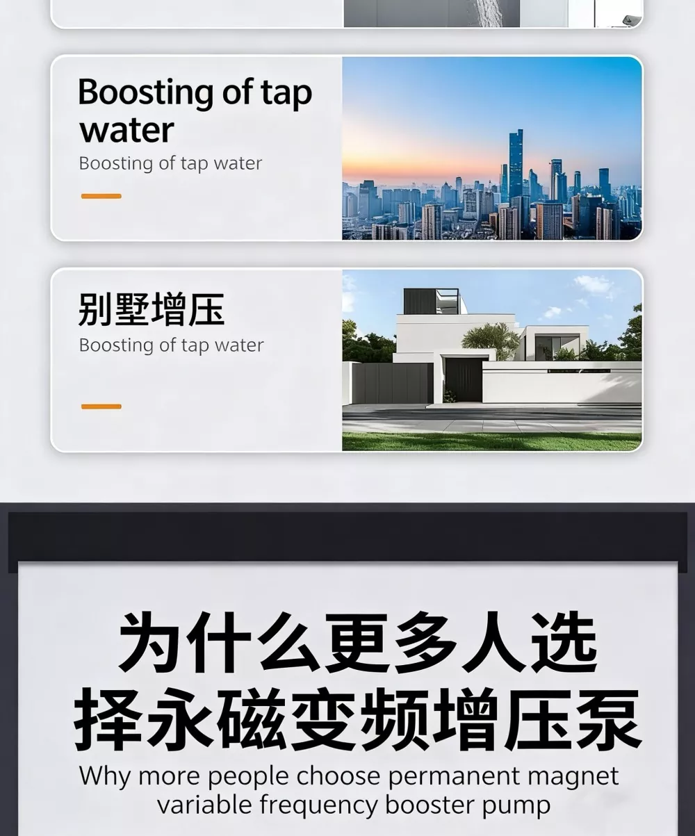 Mit umfassender Funktionskonfiguration, erstklassiger Verarbeitungsqualität und hervorragendem Benutzererlebnis bietet die Permanentmagnet-Druckerhöhungspumpe mit variabler Frequenz jeder Familie eine zuverlässigere, energiesparendere und komfortablere Haushaltswasserversorgungslösung, die Ihr hochwertiges tägliches Leben begleitet.
