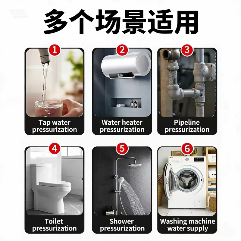 Diese kleine intelligente Druckerhöhungspumpe lässt sich weitgehend an verschiedene Haushaltsszenarien für den Wasserbedarf anpassen und passt genau auf den Druckbedarf verschiedener Wassergeräte. Zu ihren Kernanwendungsszenarien gehören: